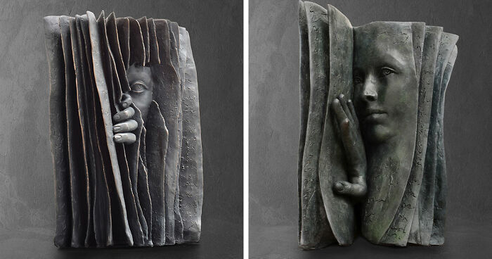 Hey! Wanna see some wild sculptures where faces peek out of books and clay like they're sneaking away from reality? Paola Grizi’s got you covered. She turns bronze and terracotta into these super cool, half-hidden faces that look like they're stuck between a dream and a storybook. It’s like the sculptures have secrets and emotions that you can almost hear whispering.
