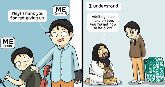 Hey there! Today, we're diving into some comics that are basically warm hugs for your brain and soul. John Euclid Templonuevo, the genius behind these simple but oh-so-relatable illustrations, reminds us it's totally okay to take a breather, laugh at ourselves, and be kind to the one person who really matters - you!