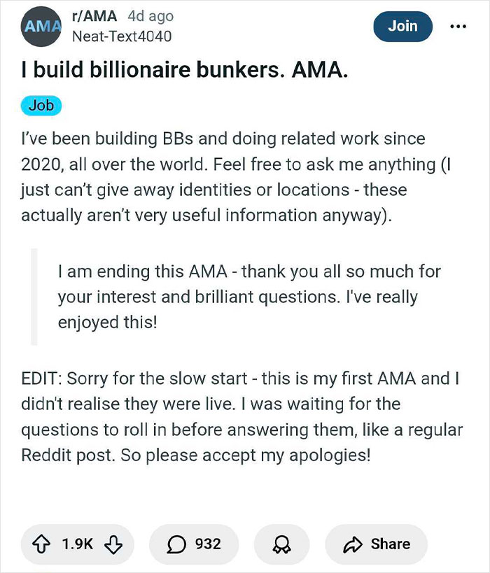 The bunker builder thought no one would care about their niche gig, but boy were they wrong! Turns out, folks can’t get enough of the idea that billionaires are prepping underground. They said, "I think it hit a chord 'cause the world’s a bit cray right now and people love seeing how the 1% get ready for anything."