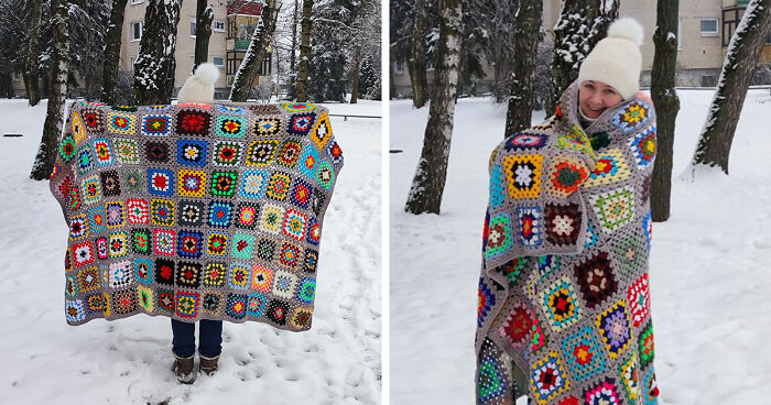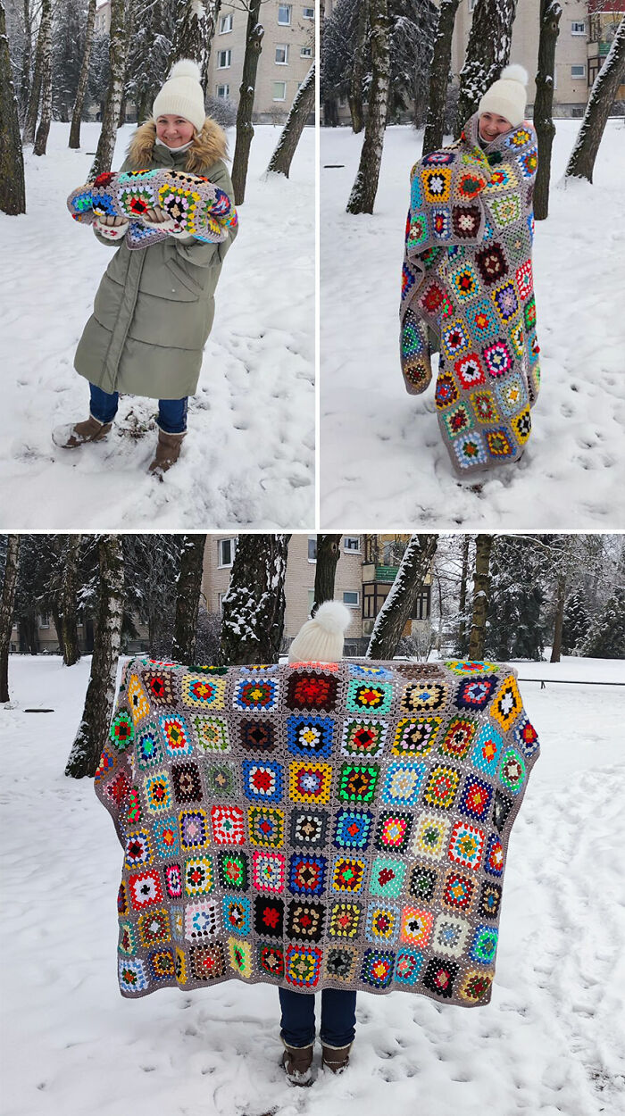After finishing 96 squares, I spent forever stitching them together. Now my blanket is done and it's like a story party made of yarn and colors. Every square tells a tale, and the whole thing screams, “I’m cozy and awesome!”