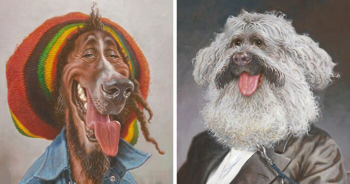 These aren't your average dog portraits. Sebastian paints every hair, shiny nose, and shiny eye perfectly but then cranks their expressions way up. They look like they’re ready for drama - or a stand-up comedy roast.