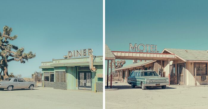 Hey, wanna take a quick trip to some super cool, kinda spooky spots? These pics are all about those forgotten places out in the California desert where old diners, empty motels, and sun-faded cars tell stories without saying a word. It’s like a dreamy peek at what used to be, frozen in time and feeling kinda magical.