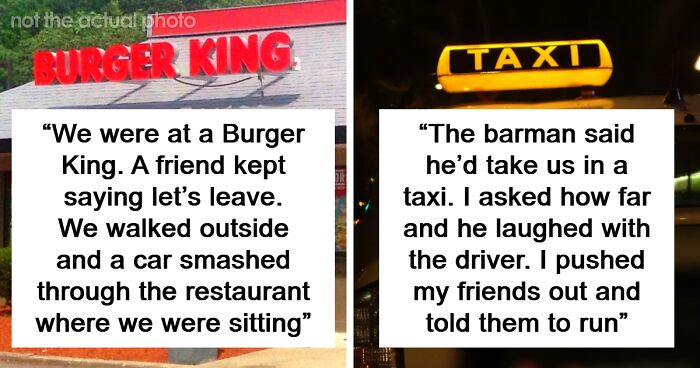 High school friends eating at Burger King. One said the place felt way too hot and insisted they leave. Everyone else thought it was fine, but they followed anyway. Thirty seconds after stepping outside, a car barreled into the restaurant where they’d just been sitting. Talk about close!