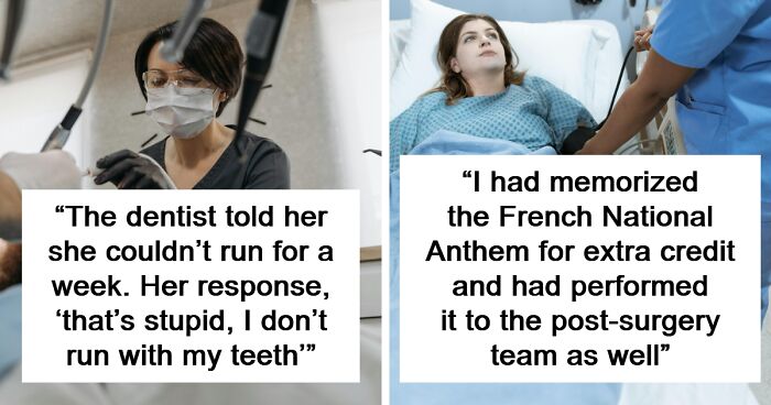 My sister’s dentist told her no running for a week after wisdom teeth removal. Her reply? "That’s stupid, I don’t run with my teeth." Logic was never this funny before anesthesia.