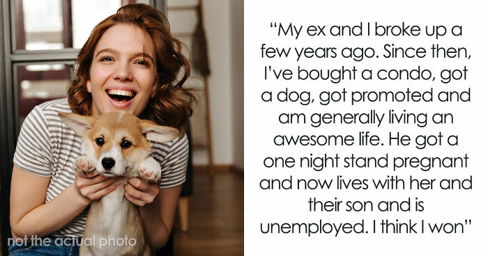Dumped a while back, felt like a wreck. Now? I own a condo, got a pup, scored a promotion, and I'm globe-trotting. Ex? Knocked up a one-night stand he didn’t even like, unemployed, living with her and their kid. Yeah, I think I’m winning here.