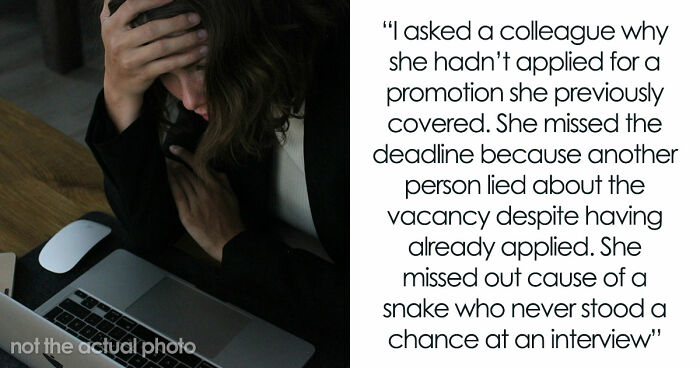 A buddy found out his coworker didn’t even apply for a big promotion she wanted. Why? Because another coworker lied to her about the vacancy, while secretly applying herself. Sneaky much? The worst part? The liar was too lazy and grumpy to even get an interview. Classic office drama!
