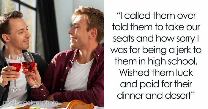 I never got picked on back in high school, but I was kinda a late bloomer and a bit of a tool sometimes. There were a couple guys I treated like my personal minions (yikes), and they happened to be a gay couple now living together. One day, I saw them at a fancy restaurant where I was celebrating an anniversary. They didn’t have a reservation and had to wait forever, so I told them to take our table, apologized for being a jerk back then, and even paid for their meal. Then me and my girlfriend grabbed fast food and had a picnic. Two weeks later, they messaged me saying it was the nicest thing anyone’s ever done, and they forgave me. Two months after that, I got a wedding invite. Life’s funny, huh?
