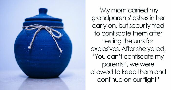 When my grandparents passed, my mom packed their ashes (in super cheap urns) in her carry-on to scatter at the ocean. At the airport, TSA swiped the boxes for explosives and tried to confiscate them. My mom wasn’t having it and yelled, "You can’t take my parents!" Thankfully, we got to keep them and fly on.